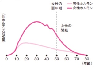 上の図でもわかる通り、女性は閉経を機に、女性ホルモンの分泌が減ってきます。